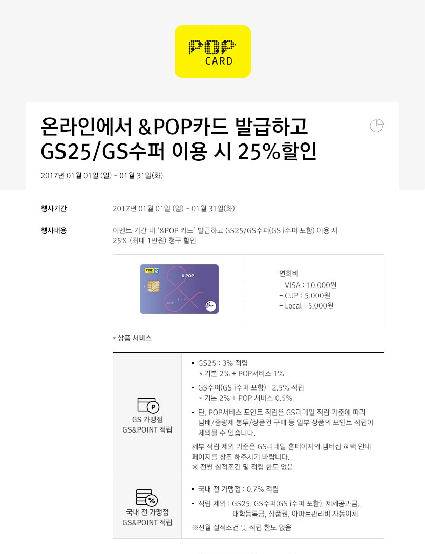 - 이벤트 기간내 '&POP카드' 발급하고 GS25/GS수퍼(GS i수퍼 포함) 이용시 25%(최대 1만원) 청구 할인