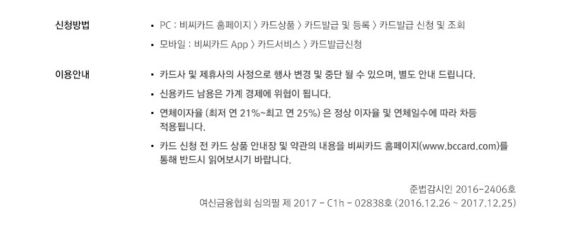 - 카드 신청 전 카드 상품 안내장 및 약관의 내용을 비씨카드 홈페이지(www.bccard.com)를 통해 반드시 읽어보시기 바랍니다.