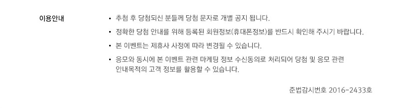 - 정확한 당첨 안내를 위해 등록된 회원정보(휴대폰정보)를 반드시 확인해 주시기 바랍니다.