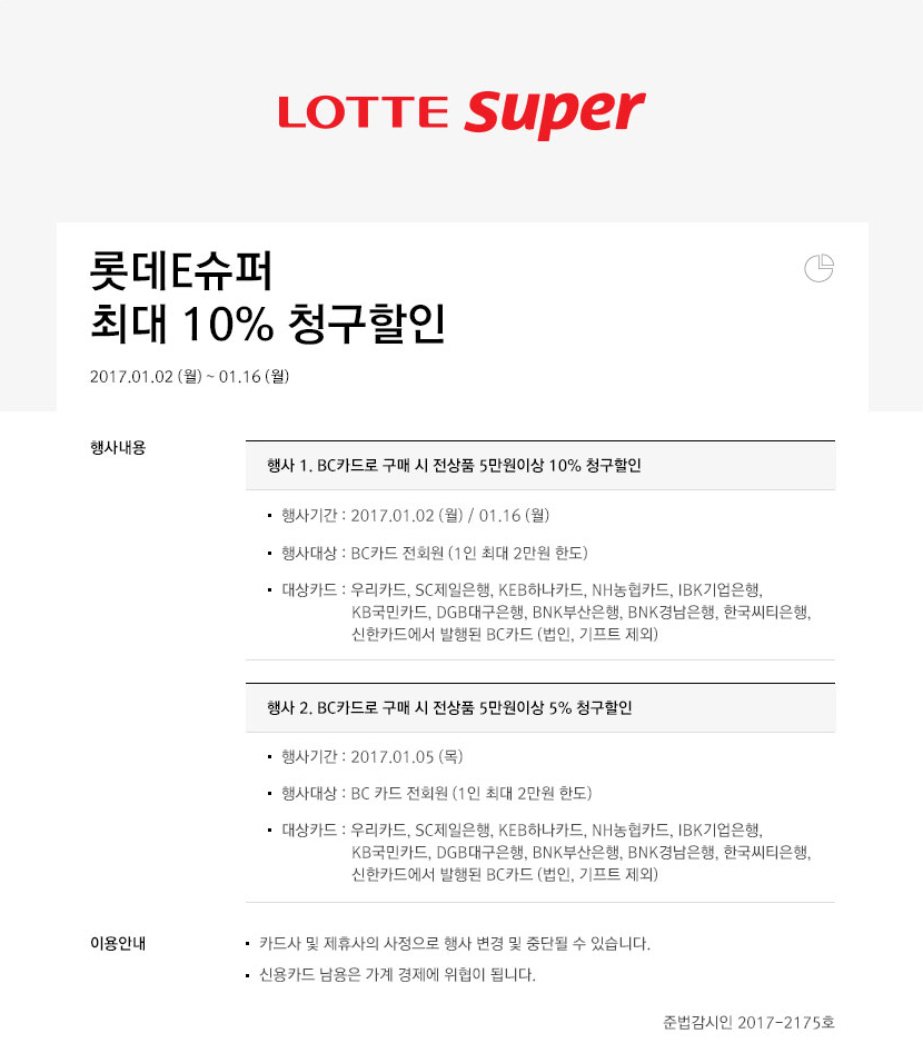 - 행사 1. BC카드로 구매 시 전상품 5만원 이상 10% 청구 할인