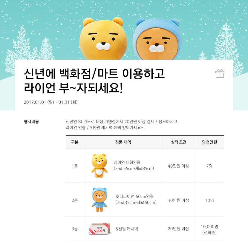 - 신년엔 BC카드로 대상 가맹점에서 20만원 이상 결제 / 응모하시고, 라이언 인형 / 5천원 캐시백 혜택 받아가세요~!