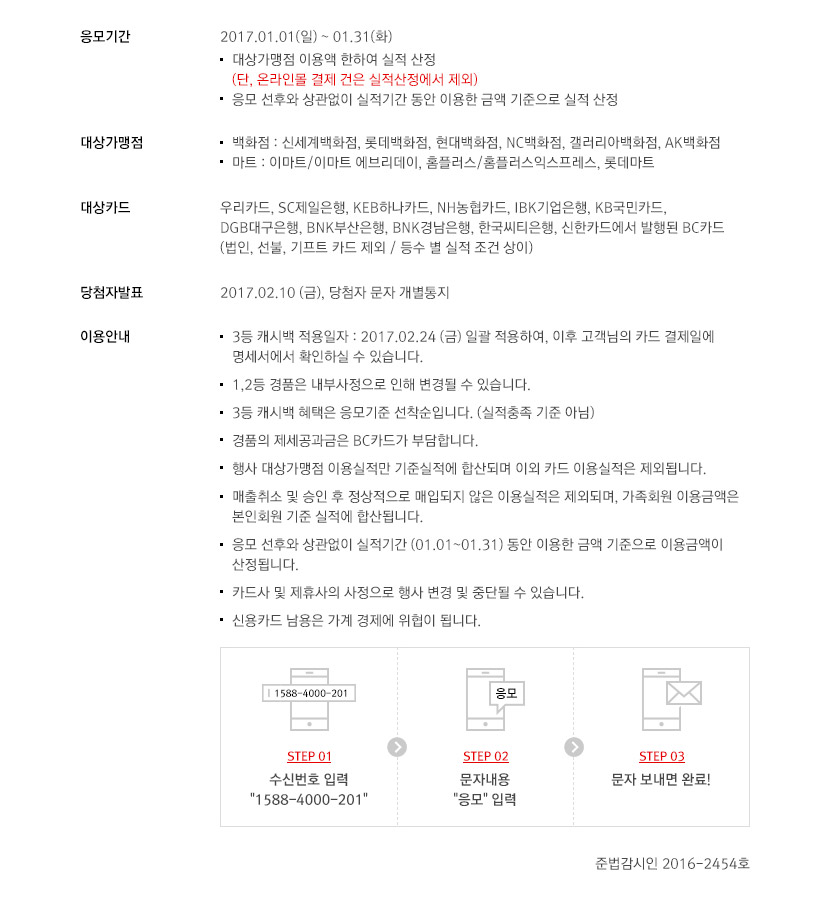 - STEP 01 : 수신번호 입력 "1588-4000-201" > STEP 02 : 문자내용 "응모"입력 > STEP 03 : 문자 보내면 완료!