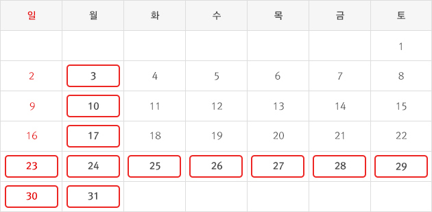 - 할인 적용일 : 월요일 – 3일, 10일, 17일, 24일, 31일 / 크리스마스 & 연말 - 23일 ~ 31일