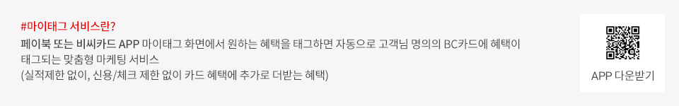 #마이태그 서비스란? 페이북 또는 BC카드 APP 마이태그 화면에서 원하는 혜택을 태그하면 자동으로 고객님 명의의 BC카드에 혜택이 태그되는 맞춤형 마케팅 서비스 (실적 제한 없이, 신용/체크 제한 없이 카드 혜택에 추가로 더 받는 혜택)