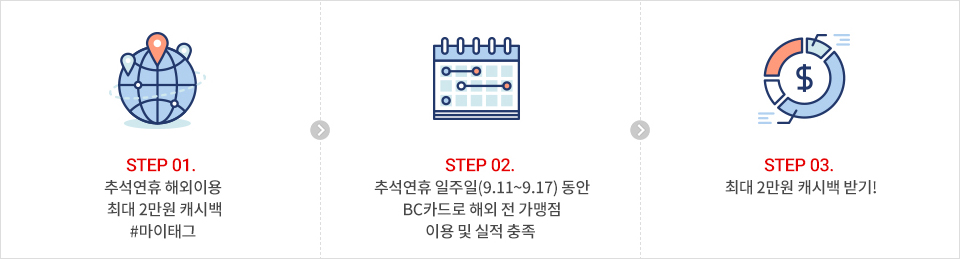 - STEP 02. 추석연휴 일주일(9.11~9.17) 동안 BC카드로 해외 전 가맹점 이용 및 실적 충족