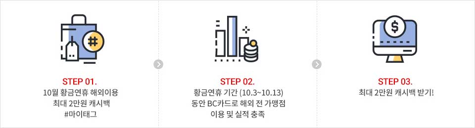 - STEP 02. 황금연휴 기간(10.3 ~ 10.13) 동안 BC카드로 해외 전 가맹점 이용 및 실적 충족