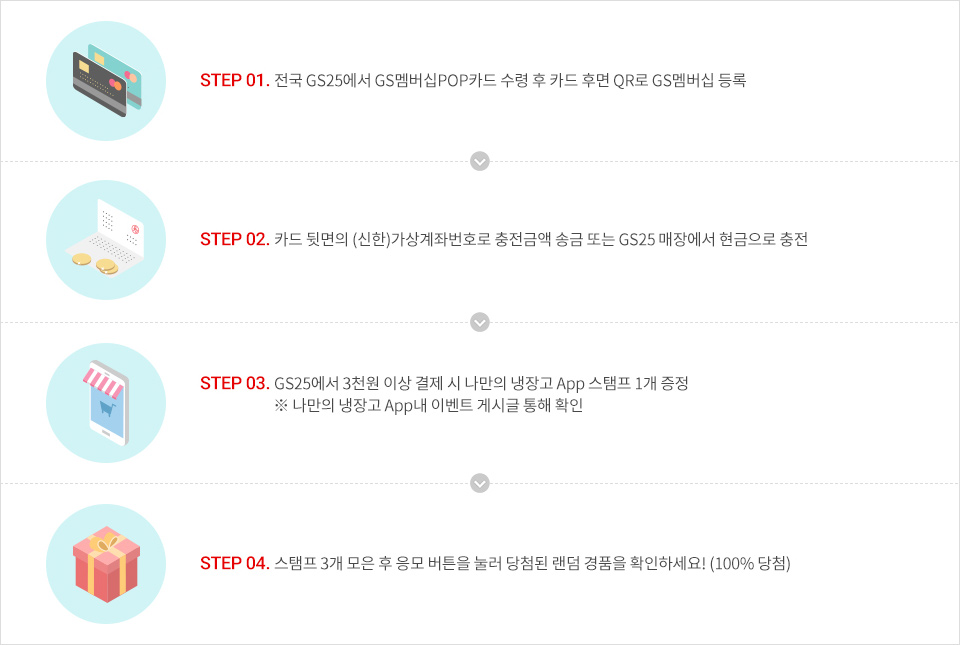 - STEP 03. GS25에서 3천원 이상 결제 시 나만의 냉장고 App 스탬프 1개 증정 / ※ 나만의 냉장고 App내 이벤트 게시글 통해 확인