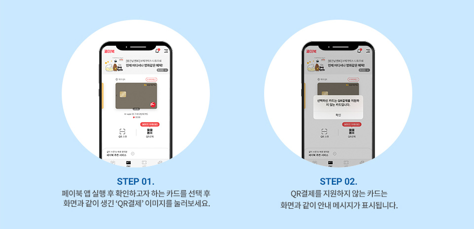 - STEP 02. QR결제를 지원하지 않는 카드는 화면과 같이 안내 메시지가 표시됩니다.