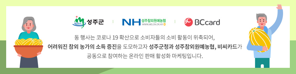 동 행사는 코로나 19 확산으로 소비자들의 소비 활동이 위축되어, 어려워진 참외 농가의 소득 증진을 도모하고자 성주군청과 성주참외원예농협, BC카드가 공동으로 참여하는 온라인 판매 활성화 마케팅입니다.