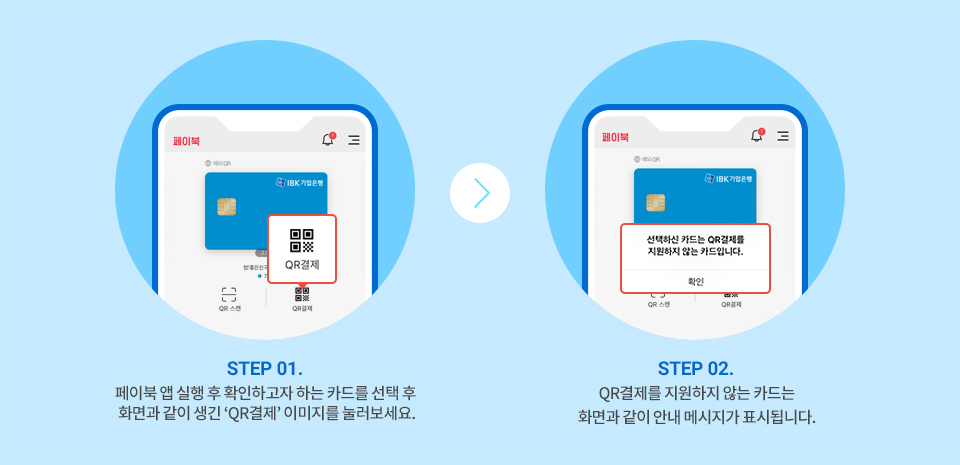 - STEP 02. QR결제를 지원하지 않는 카드는 화면과 같이 안내 메세지가 표시됩니다.