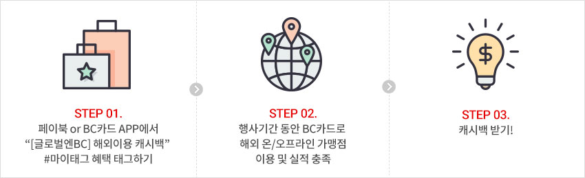 행사 기간 동안 #마이태그 태그 응모 및 해외 전 가맹점 결제 시 아래 실적 조건을 충족한 BC카드 고객에게 캐시백 혜택을 제공합니다.