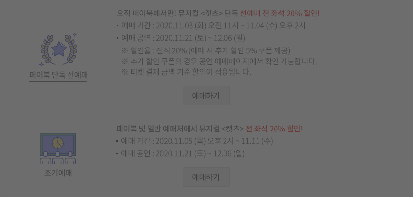 페이북 및 일반 예매처에서 뮤지컬 <캣츠> VIP석 5% / R, S, A, B석 10% 할인!