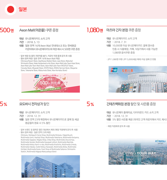 내용 : 일본 전역 23개 매장에서 유니온페이카드로 결제 및 세금 환급절차 완료 시 5% 할인